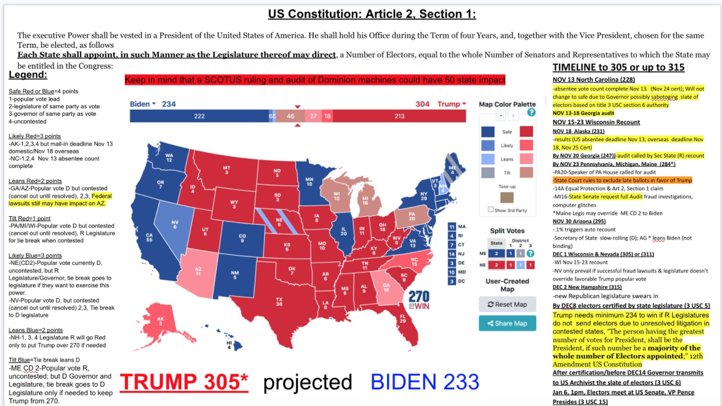 Und die Karte zeigt uns die Electoral College, die Wahlmännerstimmen, die Trump und Biden geholt haben. Trump 305 und Biden 233, wobei sich Trump noch auf 315 erhöhen könnte. Die Staaten an der Westküste könnten sich auch noch auf rot ändern, speziell Kalifornien. Erinnerst Du Dich, dass Q sagte: Beobachte Kalifornien?