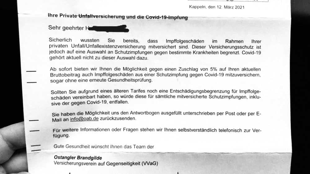 „Sicherlich wussten Sie bereits, dass Impffolgeschäden im Rahmen Ihrer privaten Unfall/Unfallexistenzversicherung mitversichert sind. Dieser Versicherungsschutz ist allerdings auf eine Auswahl an Schutzimpfungen gegen bestimmte Krankheiten begrenzt. Covid-19 gehört aktuell nicht zu dieser Auswahl dazu.“ Textauszug OAB Versicherung, Kappeln den 12. März 2021