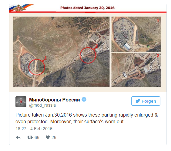 Konaschenkow zeigte zudem Fotos von Lastwagen-Standplätzen an der türkisch-syrischen Grenze, die von der syrischen Seite von Terroristen kontrolliert werden, vom 26. Oktober 2015 und vom 30. Januar des laufenden Jahres zum Vergleich.