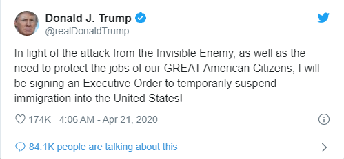 Washington. US-Präsident Donald Trump will jegliche Einwanderung in die Vereinigten Staaten zeitweise aussetzen. Er werde einen dahingehenden Erlass unterzeichnen, schrieb er am Montagabend (Ortszeit) auf Twitter. Als Begründung führte Trump mit Blick auf die Coronavirus-Pandemie den „Angriff des unsichtbaren Feindes“ an sowie die Notwendigkeit, die „Jobs unserer großartigen amerikanischen Staatsbürger“ zu schützen.