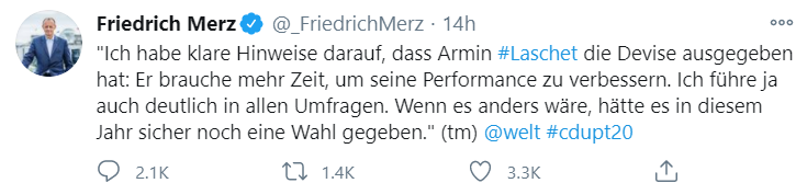 Wie auch immer! Die CDU scheint gespalten. Doch das sollte für uns, die wir sie noch nie gewählt haben oder schon längere Zeit nicht mehr wählen, kein Grund zur Freude sein. Denn der Vorgang um den Bundesparteitag offenbart auch eins: Die Macht liegt bei denen, für die Demokratie nur noch eine Worthülse ist. Es gibt nur noch eine kleine Chance, um zumindest die totale Spaltung der Gesellschaft zu verhindern. Und das ist Friedrich Merz. Mit Laschet – Röttgen können wir getrost als Option vernachlässigen – wird sich die Union noch weiter nach links verschieben und der Ökosozialismus schon in wenigen Jahren die Herrschaft übernehmen.