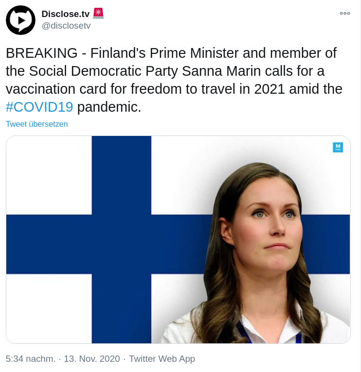 „Finnlands Premierministerin und Mitglied der Sozialdemokratischen Partei Sanna Marin fordert einen Impfausweis für Reisefreiheit im Jahr 2021 angesichts der COVID19-Pandemie.“