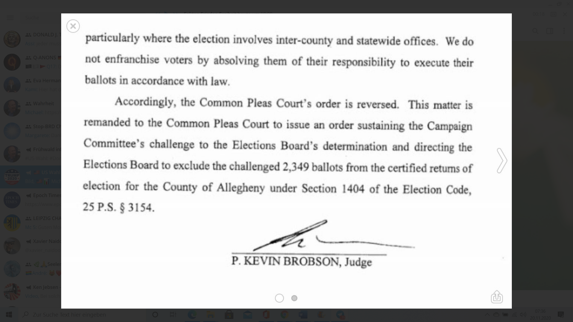 2.349 Briefwahlzettel aus dem Landkreis Allegheny ungültig! Dies entschied ein Richter des Commonwealth-Gerichtshofs von Pennsylvania, da auf diesen Zetteln der Wähler jeweils seine Erklärung nicht datiert hatte. Damit ist die Entscheidung eines unteren Gerichts rückgängig gemacht worden.