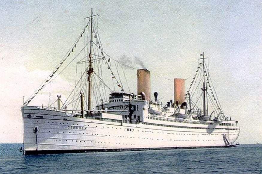Am 9. Februar 1945 zum Zeitpunkt, als man in größter Verzweiflung nochmal alles einsetze, um die restlichen Flüchtlinge vor den an nahenden Bolschewiken in Sicherheit zubringen, lief die Steuben von Pillau in Richtung Kiel aus. Auf der Höhe von Stolpmünde vor der Deutschen Ostseeküste, wurde sie um 12.30 Uhr von dem sowjetischen U-Boot S-13 unter Kriegsverbrecher Kapitän Alexander Marienesko durch 2 Torpedos versenkt. Kurze Zeit vorher wurde vom gleichen U-Boot die Wilhelm Gutsloff versenkt. Die Steuben versank Bug voraus und riss 4.000 Flüchtlinge in die Tiefe. Das Schiff sank innerhalb von 15 Minuten. Augenzeugen dieser schrecklichen Tat berichteten, dass aus dem Unterdeck Schüsse vielen. Verwundete Soldaten entschieden sich für den Freitod und erschossen sich gegenseitig. Keiner dieser Männer wollte elend ertrinken. Dadurch das Schiff so schnell versank gelang es dem Personal nicht, die Menschen rechtzeitig vom Schiff zu evakuieren.