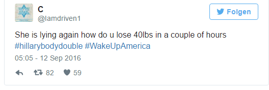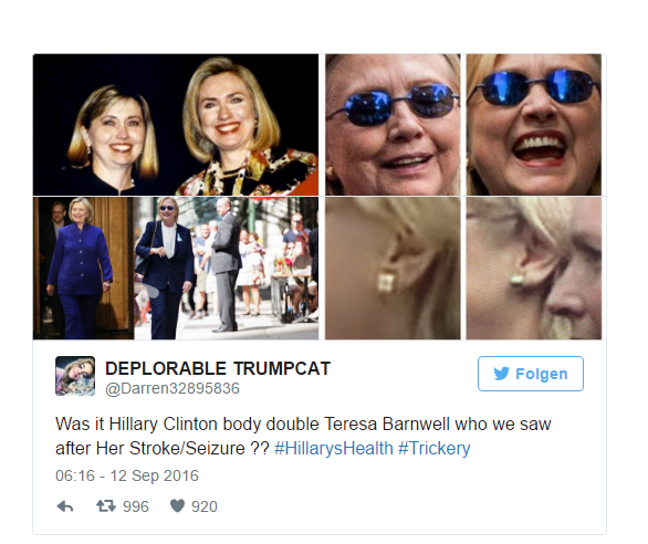 Daraufhin meldeten sich zahlreiche Verschwörungstheoretiker in sozialen Netzwerken zu Wort. Sie sind überzeugt: Die Ex-Außenministerin Clinton sei durch eine Doppelgängerin ersetzt worden. Als „Beweis“ posteten sie Fotos von vermeintlichen körperlichen Unterschieden zwischen den „beiden“ Frauen.