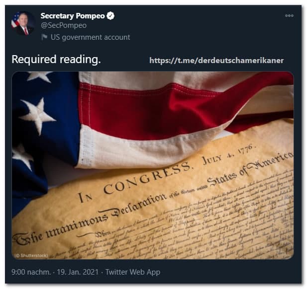 Soeben twitterte Pompeo die Unabhängigkeitserklärung von 1776, mit der Bemerkung „Pflichtlektüre?